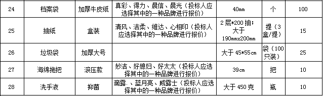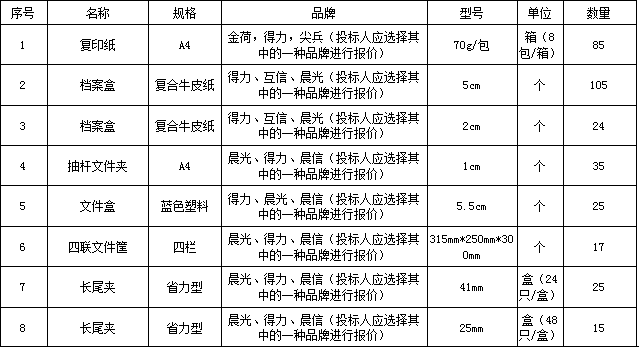| 招標范圍 | 包括但不限于辦公用品的生產(chǎn)供貨、包裝、運輸、檢測、驗收、質保及售后服務等。如有漏項或缺項,投標人承擔全部責任。 | |||||||||