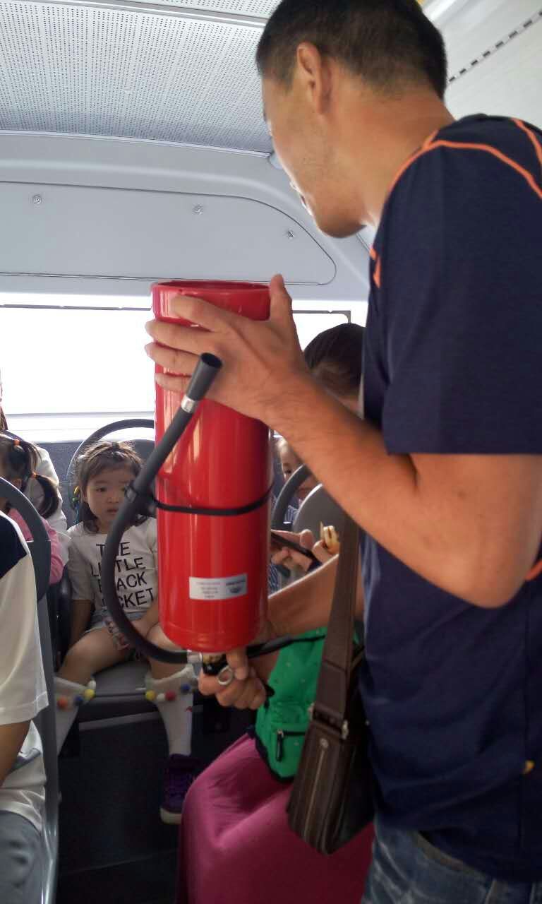 孩子們在家長陪同下,來到107路實驗三小站臺,工作人員詳細向孩子們講解安全文明乘車需要注意的事項。如何有序地安全上、下車?進車廂內(nèi)為什么要扶穩(wěn)坐好?在公交車上與親人走散后怎么辦?如何使用安全錘、滅火器等常見的安全問題,提醒孩子們及家長乘坐公交車一定要遵守乘車秩序,安全文明乘車。接著,工作人員邀請小朋友及家長乘坐107路公交車,并模擬乘車過程遇到急剎車等突發(fā)狀況時的情景。同時與小朋友們互動,演示安全錘和滅火器的使用方法,這一環(huán)節(jié)受到家長的鼓掌點贊。