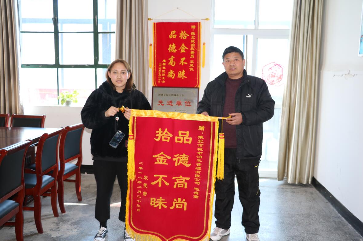 2月23日下午,市民宋女士將一面寫著“品德高尚,拾金不昧”的錦旗送到了城泊公司,她要感謝的是公司收費(fèi)員毛貴菊。