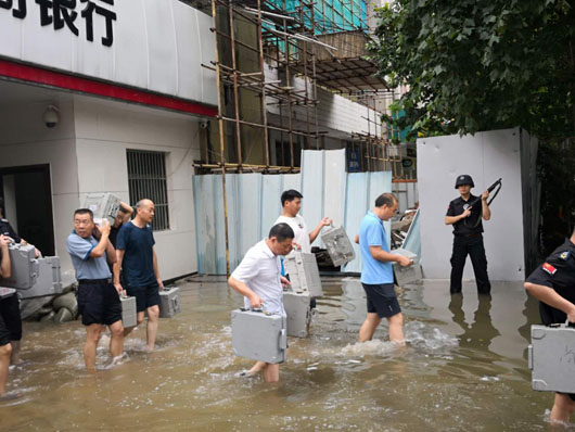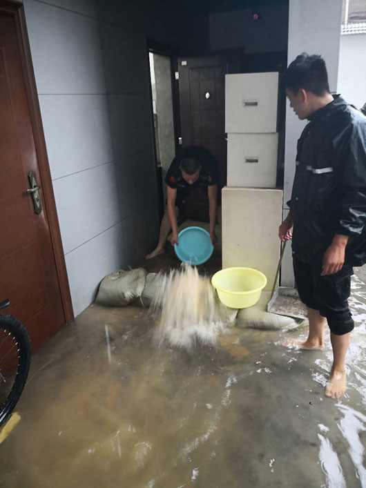19日清晨,由于雨勢(shì)較大,加之街道排水不暢,濉溪農(nóng)商銀行金庫(kù)進(jìn)水被浸泡?;幢笔斜0灿邢薰狙哼\(yùn)三中隊(duì)隊(duì)員與銀行金庫(kù)人員堅(jiān)守在第一線,迅速展開(kāi)自救,用事先準(zhǔn)備好的沙袋將聯(lián)動(dòng)門(mén)圍裹后,用水泵、水盆等工具將積水外排。