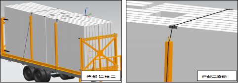 a. 墻板運(yùn)輸,必需使用直徑不小于8.7天然纖維芯鋼絲繩或3.5T手動(dòng)葫蘆,將運(yùn)輸架與車(chē)架載重平板綁緊,且前端與后端至少兩根,鋼絲繩與構(gòu)件接觸部位需用護(hù)角保護(hù);