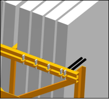 c. 墻板運(yùn)輸前,每塊構(gòu)件必需用鐵桿插銷(xiāo)固定,外面兩側(cè)(上、下部位)用2根鐵桿插銷(xiāo)固定,中間每塊構(gòu)件上、下部位,均用一根插銷(xiāo)固定,如下圖示: